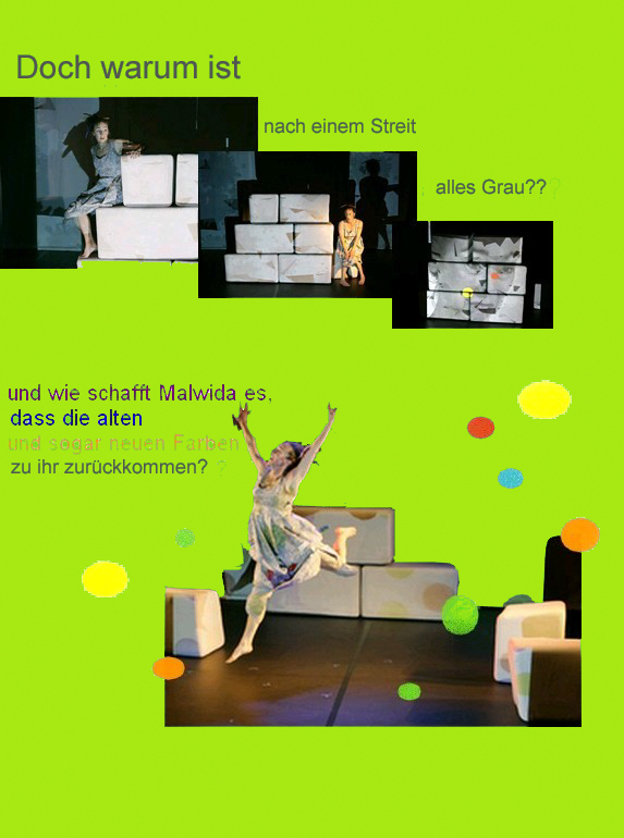 Wie es Malwida gelingt, die Farben zurückzuholen, zeigt das Theater „die da“ voller Lebendigkeit und Lebensfreude. In einer außergewöhnlichen Kombination von Tanz, Theater und Film entsteht ein faszinierendes Stück für Kinder ab 4 Jahren und die ganze Familie.